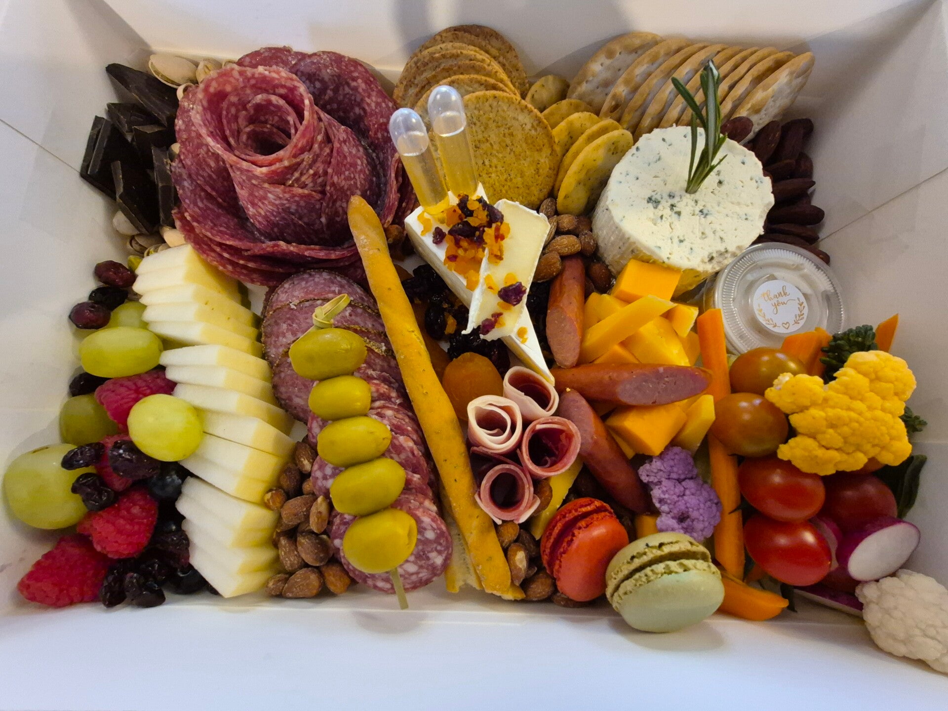 A beautifully curated selection of gourmet cheeses, premium meats, fresh fruit, nuts, and accompaniments—artfully arranged in a 13” x 10” box.