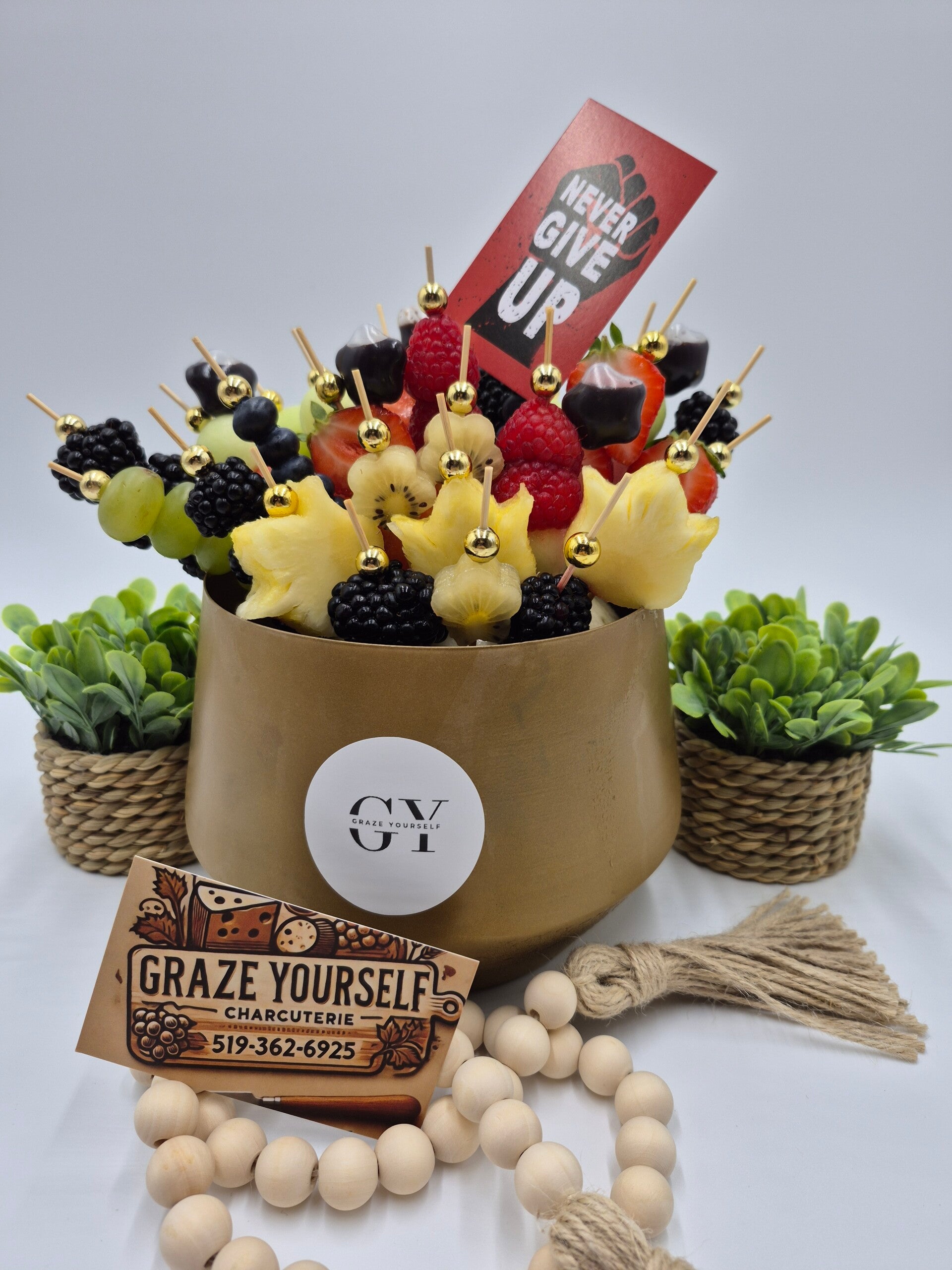 Add a burst of color and freshness to any occasion with our handcrafted fruit arrangements. Each creation is made with care, featuring a vibrant mix of seasonal fruit beautifully arranged in a stylish pot.