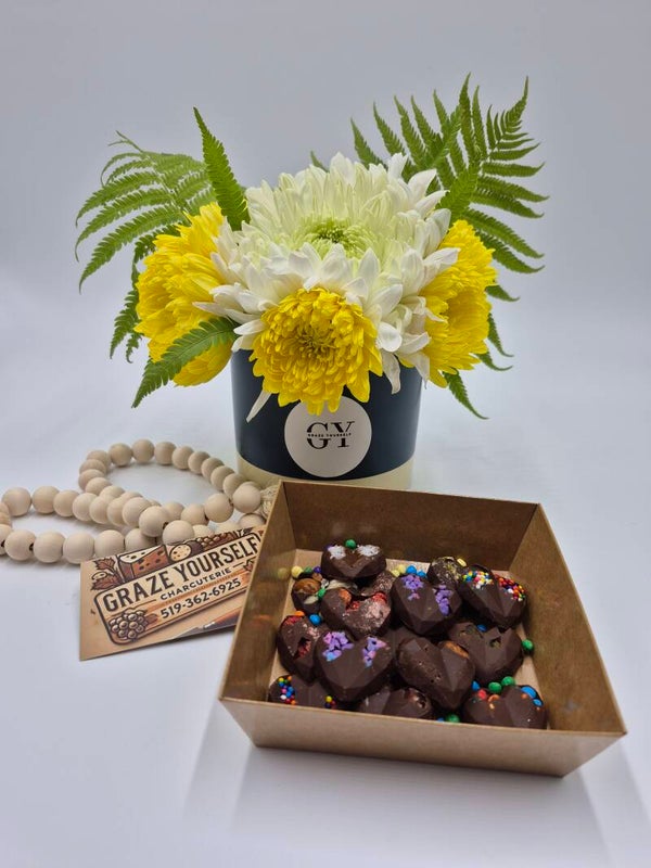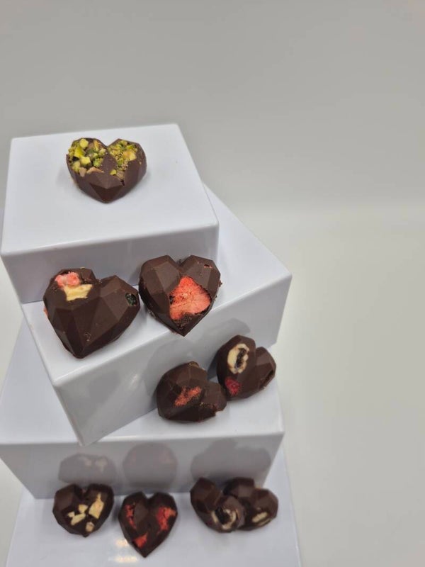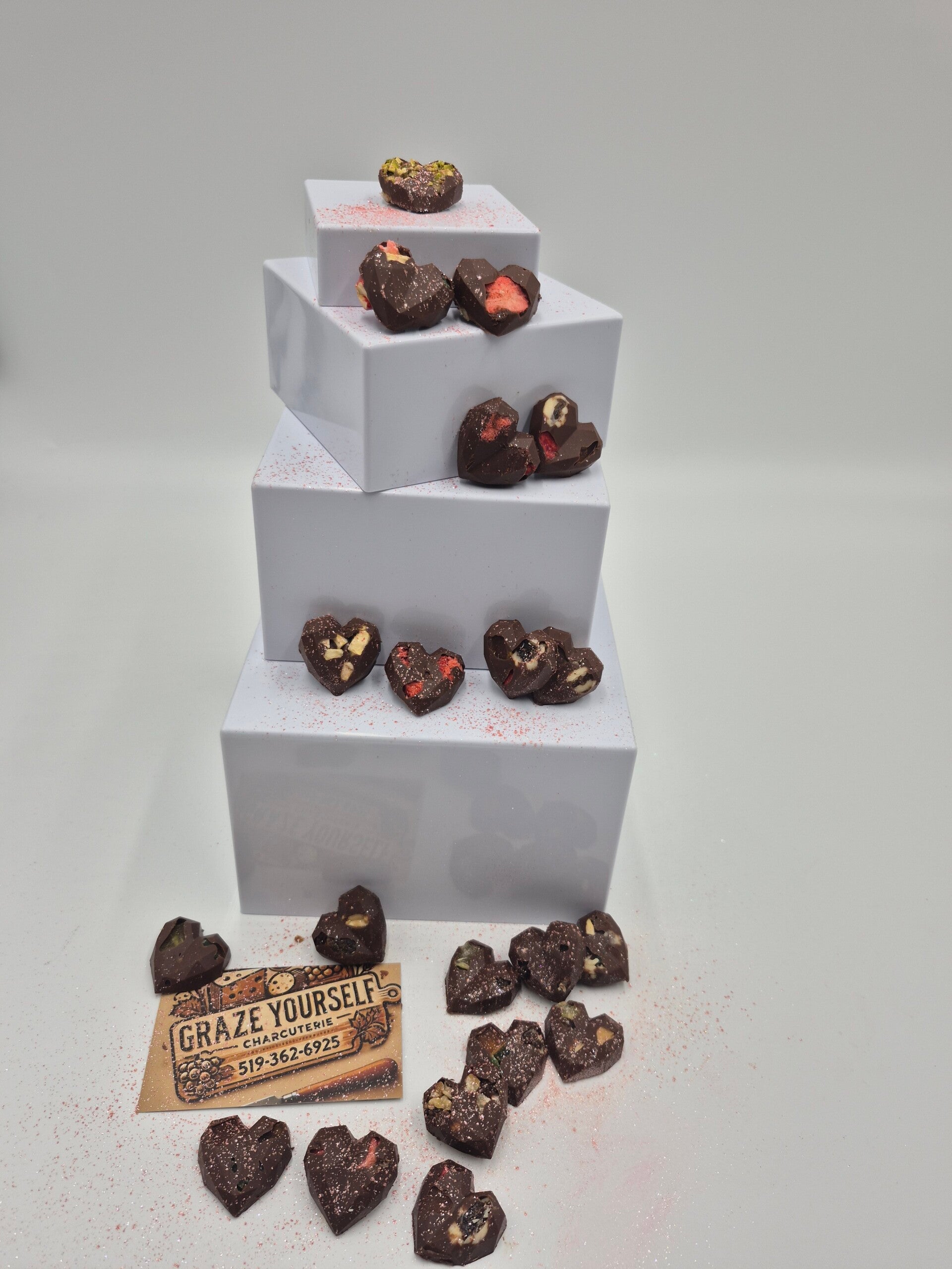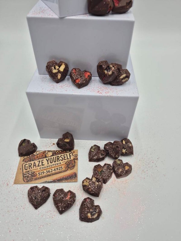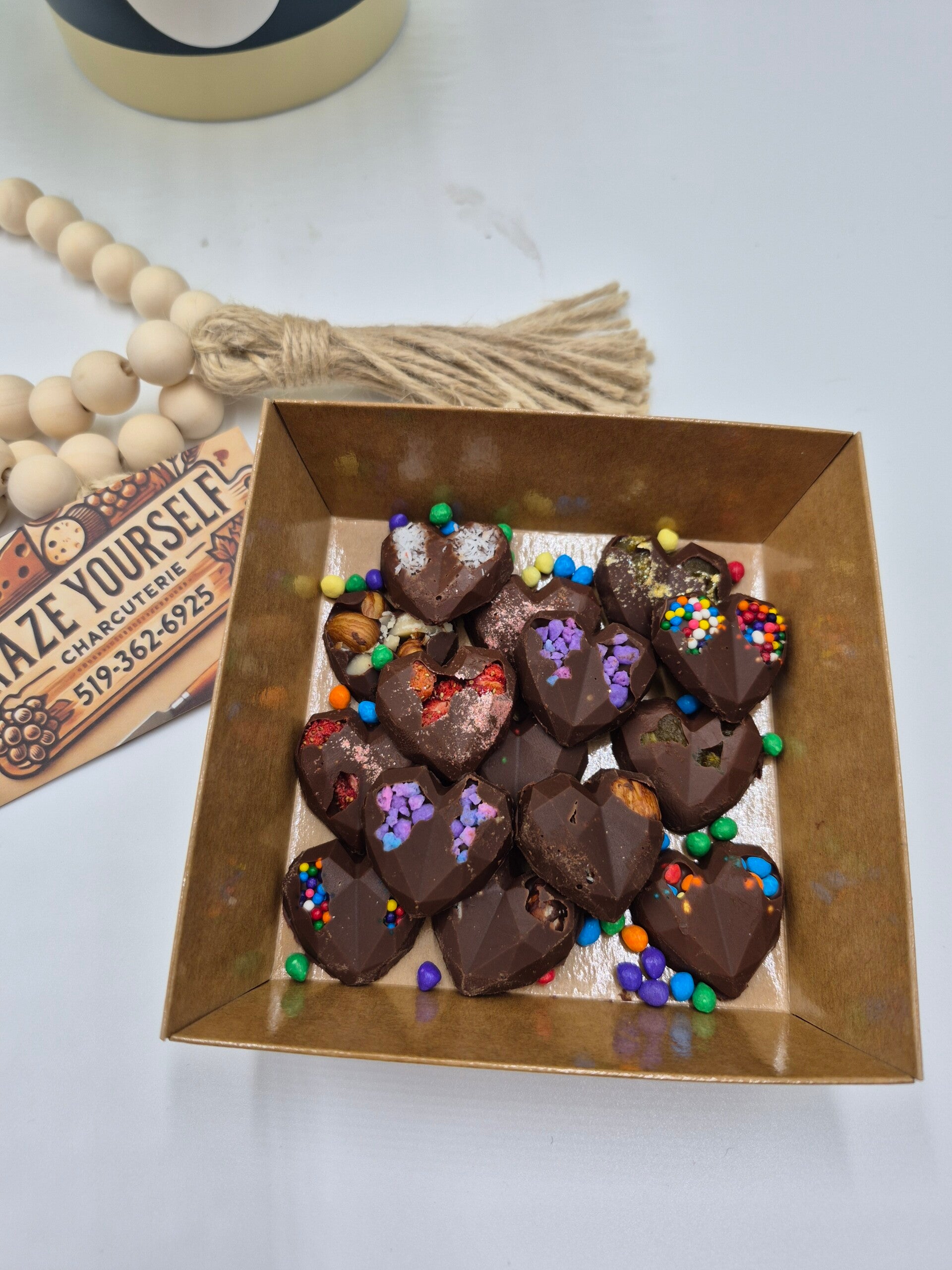 These handcrafted chocolate hearts are made with premium chocolate and topped with a playful mix of sprinkles, nuts, dried fruit, candy, and edible shimmer.