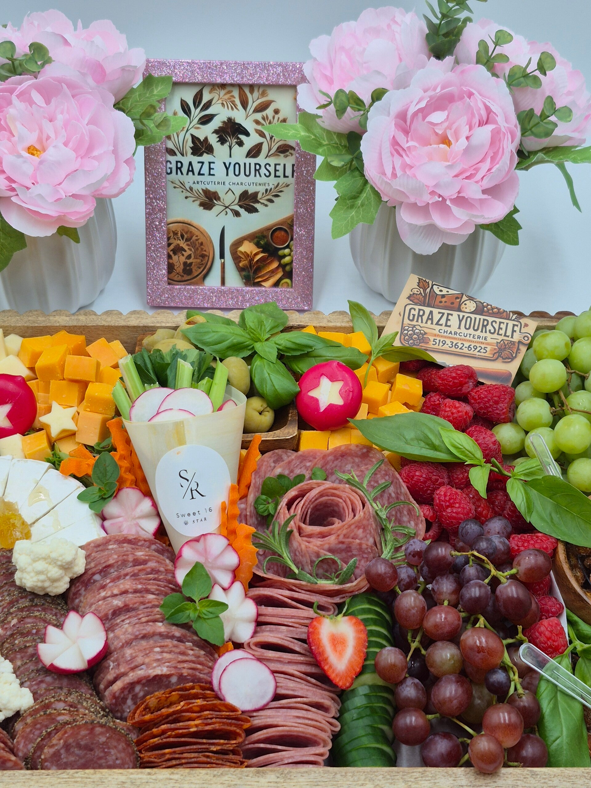 A stunning centerpiece for any special occasion, this tray is filled with a generous variety of cured meats, fresh fruits, crisp vegetables, crunchy nuts, and sweet touches. Styled with vibrant colors and thoughtful details, it’s perfect for birthdays, parties, and gatherings where you want to impress and enjoy a little of everything.