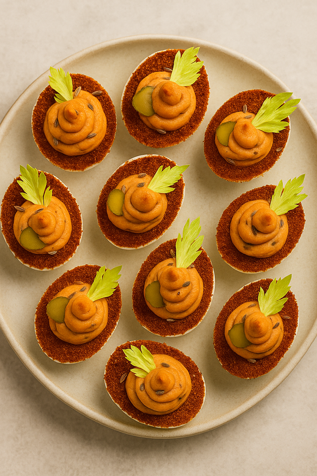 Spicy, tangy, and beautifully garnished — our Bloody Mary Deviled Eggs bring bold flavor to any graze. Each half is rimmed with smoky paprika, filled with a creamy tomato-Dijon yolk, and topped with a crisp celery leaf and pickle slice for that classic Bloody Mary vibe.